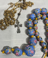 The necklace has lavender-blue Fiorate (wedding-cake) Murano beads from early 1900 combined with a handmade amber bead. Furthermore old Italian gold plated Rosary/ prayer beads. The upper half is made of old yellow seed beads from the remaining Conteríe Murano production that stopped i 1986. The metal parts are gold plated bras.