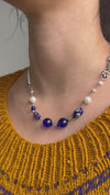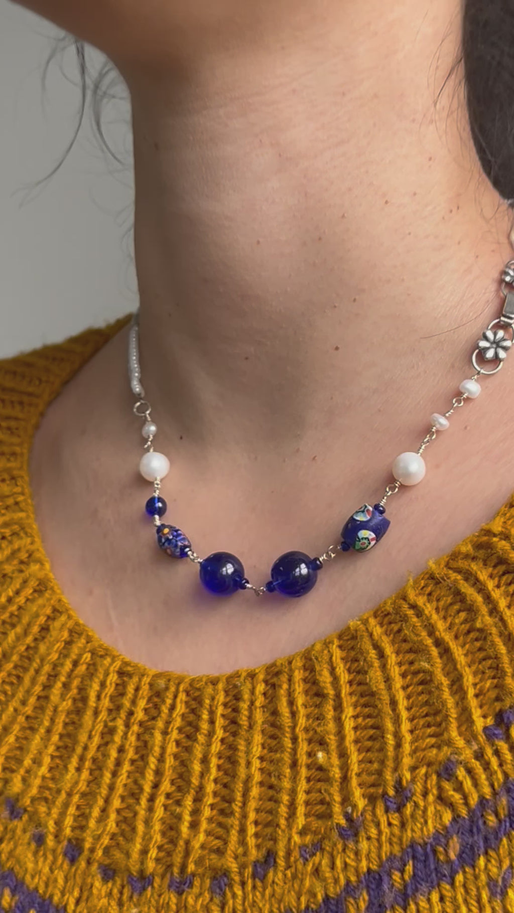 Silver necklace with different old Murano beads - small seed beads from 1980´s, clear blue glass beads and two antique Millefiori beads. Furthermore there is added freshwater pearls and Sterling silver pieces plus lock from an old Swedish bracelet.